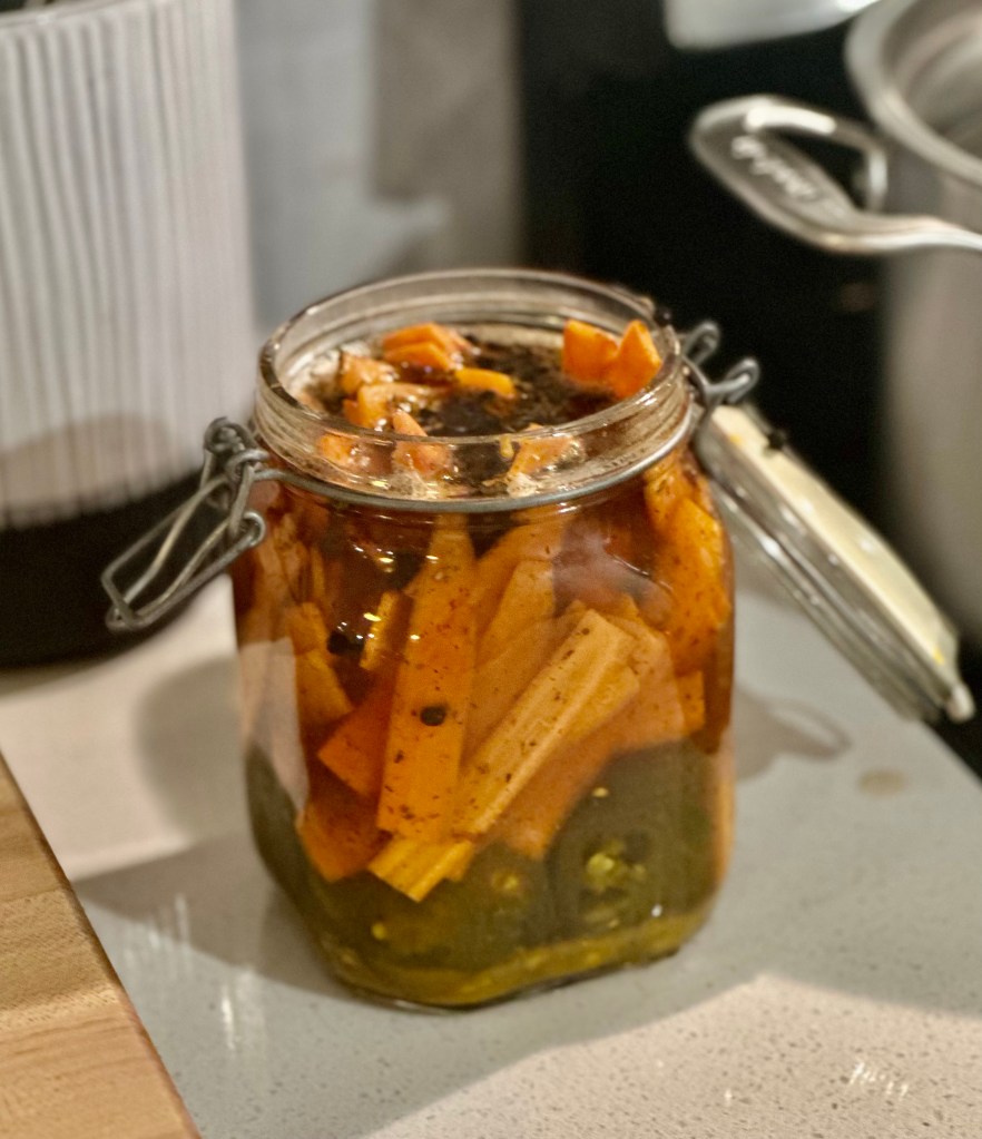 For this recipe I took some apple cider vinegar, water, sugar, and whole peppercorns and made a pickling liquid. And then I mandolin’d some carrots into strips and added them to the jar with my sweet jalapeño slices. And I added the pickling liquid over the carrots.
